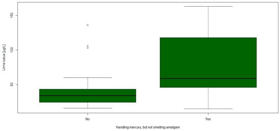 Boxplot of mercury in urine stratified by the job category “Handling mercury, but not smelting amalgam”.