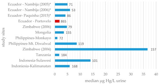The estimated distribution showed strong tailing to the right side, as was shown in other countries as well, which means that most participants had low levels and only few participants showed high to very high levels of mercury in urine (see Figure 1) [5,6,20]. In comparison with other ASGM areas previously mentioned, urine concentrations were very low, actually lower than expected. In a study from 2011, miners from eight different mining areas in six different countries were analysed and the Hg in urine assessed [8]. Furthermore, compared to the results of that study, the in Ecuador assessed median and the 95th percentile are third to the lowest and the maximum is fourth to the lowest (Figure 6). The pooled values from all those areas are each higher than those we assessed [8]. The reported results from that study were consistent with and could be shown in another study of the same kind [6].