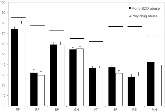 Score in the SF-36 dimensions. Closed bars: mono-BZD misusers (either one or more BZDs, n = 166); open bars: poly-drug misusers (n = 101). The SF-36 scores ranged from 0 (worst score) to 100 (best score). None of the dimensions significantly differed between the two groups. Horizontal bars indicate the mean score in the Italian population [8,24]. Vertical error bars equal one SEM. BP: Bodily pain; BZD: Benzodiazepine; GH: General health; MH: Mental health; PF: Physical functioning; RE: Role emotional; RF: Role physical; SF: Social functioning; SF-36: Short Form-36; VT: Vitality.