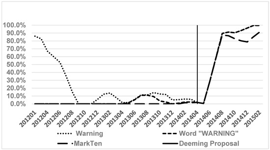 Results show that, after using weighted measures reflecting ad exposure, the prevalence of voluntary ENDS warnings increased markedly after the FDA issued their deeming proposal in April 2014. Although Blu ads included the California proposition 65 warning in early 2012, this warning disappeared after the acquisition of Blu by Lorillard in mid-2012 [16]. Since then, the prevalence of voluntary warnings in magazine ads had been relatively low until the FDA deeming proposal. After the April 2014 deeming proposal, MarkTen dominated ENDS magazine advertising and has driven the prevalence of warnings to almost 100% as of March 2015.