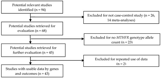 - Wang, H.; Wang, J.; Zhao, L.; Liu, X.; Mi, W. Methylenetetrahydrofolate reductase polymorphisms and risk of acute lymphoblastic leukemia-evidence from an updated meta-analysis including 35 studies. BMC Med. Genet. 2012, 13, 77. [Google Scholar] [CrossRef] [PubMed]