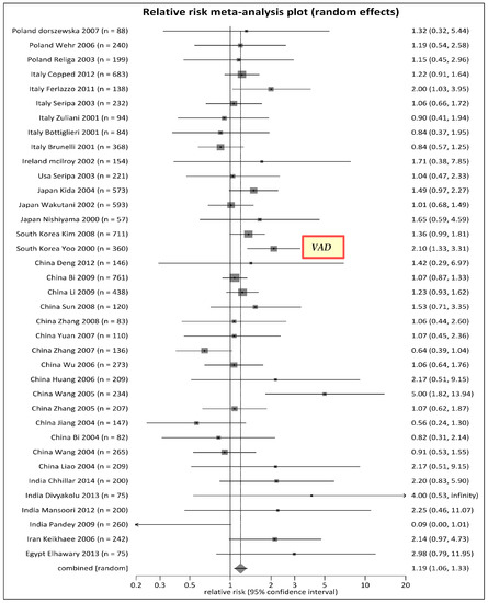 Forest plot for meta-analysis of MTHFR C677T polymorphism by TT genotype, countries with risks > 1. Note: VAD: Vascular Alzheimer’s disease in one South Korean Study having RR > 2.