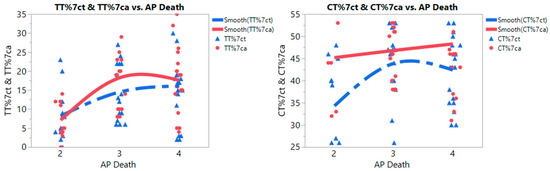 Nonlinear curve fits of MTHFR C677T Polymorphism TT (left) and CT (right) genotypes of control and Alzheimer’s disease (AD) groups with annual death rates from air pollution (AP death) per million population (Levels: 2 = 50–100 deaths/million, 3 = 100–250 deaths, 4 = 250–400+ deaths). Note: TT%7ct: Percentage of MTHFR C677T TT genotype in control group; TT%7ca: Percentage of MTHFR C677T TT genotype in AD group; CT%7ct: Percentage of MTHFR C677T CT genotype in control group; CT%7ca: Percentage of MTHFR C677T CT genotype in AD group.