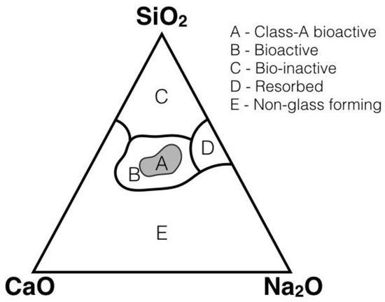 There are now many more bioactive glasses/glass ceramics [29,30] as well as sintered hydroxyapatite (Ca10(PO4)6(OH)2) [31]. Bioactive glasses are silicate-based amorphous materials which properties change with composition, as shown in Figure 1. Bioactive glasses become coated with a layer of apatite as a response to contact with physiological fluids, and this layer then acts to promote the formation of new bone. In vitro studies have shown that apatite formation depends on several factors [32,33,34], including surface area and porosity [35,36].