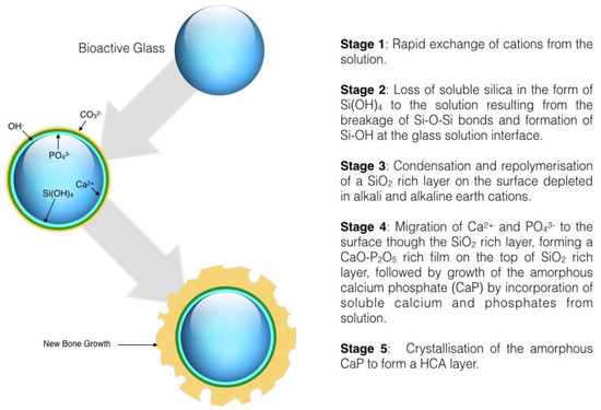The first bioactive glass developed by Hench et al. in 1969 [3] was Na2O-CaO-P2O5-SiO2. Hench described in detail the reactions that occur during the bond formation, which in relation to SiO2-CaO-P2O5 Sol-Gel glasses is represented by the five steps shown in Figure 3 [27,28].