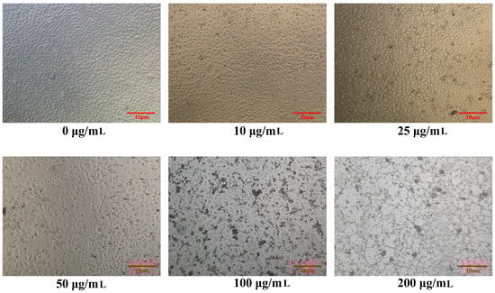 The morphology of HaCaT cells was observed after being stimulated by different concentrations of PM2.5 (Figure 1). When treated with 0 μg/mL PM2.5, the HaCaT cells showed a normal shape. However, with the increase in PM2.5 concentration, the cell membrane was impaired and the dead cells increased.