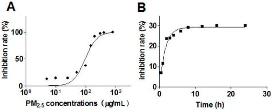 Cell Counting Kit-8 (CCK-8) (Dojindo Laboratories, Tokyo, Japan) is widely used to test cell proliferation and cytotoxicity with high accuracy. In order to observe the cell viability of different concentrations of PM2.5, cell viability was determined in HaCaT cells after being treated with 0–800 μg/mL PM2.5. Then, the time-response was determined at different exposure times. After treatment with 50 μg/mL PM2.5, the HaCaT cells were incubated for 0.5 h, 1 h, 2 h, 3 h, 4 h, 6 h, 8 h, 12 h, 16 h and 24 h, respectively. Enzyme ferment was used to test the cell viability by reading absorbance at 450 nm. The inhibition ratio was calculated and a growth curve was printed. The calculation formula is as follows:
