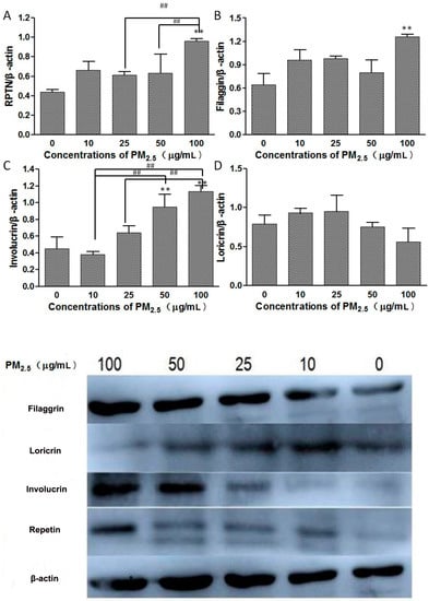 Proteins expression of Repetin (A); Filaggrin (B); Involucrin (C); and Loricrin (D) in HaCaT cells after being exposed to different concentrations of PM2.5 (0, 10, 25, 50, and 100 μg/mL) for 24 h. ** There were significant differences (p < 0.01) between the exposed group and the control. ## There were significant differences (p < 0.01) between the exposure groups. (Analysis of variance (ANOVA) statistics was used to calculate the statistical difference between the exposed group and the control and between the four exposed groups. Each analysis was carried out three times independently).