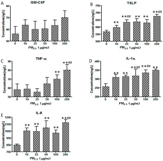 Levels of Granulocyte-macrophage Colony Stimulating Factor (GM-CSF) (A); Thymic Stromal Lymphopoietin (TSLP) (B); Tumor Necrosis Factor-α (TNF-α) (C); Interleukin-1α (IL-1α) (D); and Interleukin-8 (IL-8) (E) in HaCaT cells after being exposed to fine particles for 24 h. In each figure, the exposed doses from left to right are 0, 10, 25, 50, 100, and 200 μg/mL. ** There were significant differences (p < 0.01) between the exposed group and the control. ## There were significant differences (p < 0.01) between the group and the former group. (ANOVA statistics was used to calculate the statistical difference between the exposed group and the control and between the exposed group and its adjacent former group. Each analysis was carried out three times independently).