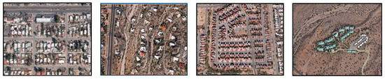 Four common neighborhood designs in Tucson, AZ, USA. From left to right, a traditional development, a suburban development, an enclosed community, and a cluster housing development. (Images from Google Earth).