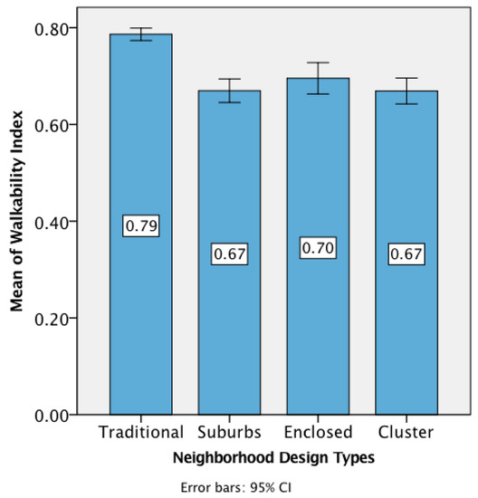 The relationship between neighborhood design and Walkability Index shows the highest mean for traditional development, significantly different from the other neighborhood design types in terms of walkability.