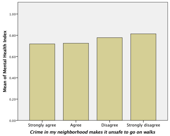 Our analysis revealed that neither physical activity nor the two motivations of walking (transportation and recreation) were significantly associated with perceived crime. However, perceived crime was significantly associated to wellbeing (p = 0.002; R = 0.092), and mental health (p = 0.001; R = 0.59), and these associations were inverse. For example, as the values of perceived crime decreased, the mean values of mental health increased (Figure 3). Because we found perceived crime significantly related to the presence of incivilities (trash, graffiti, and stray dogs; p < 0.001; R = 0.193), we examined the relationship between mental health and incivilities and found significant results (p = 0.028; R = 0.056).