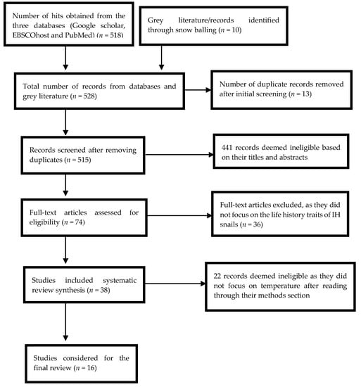 The systematic literature search yielded a total of five hundred and twenty-eight hits which included abstracts, reports, books and duplicate articles (Figure 1). Four hundred and ninety articles were excluded due to duplication and did not explicitly report on temperature in relation to Bulinus (hereafter abbreviated as Bu.) and Biomphalaria (hereafter abbreviated as Bi.) snail species as the IH of schistosomes that cause human schistosomiasis. A further twenty-two articles were excluded as they did not focus on temperature related studies although they looked at the life history traits of IH snails. Sixteen publications were considered for this review (Table 1). The results from the publications that were eligible for the review were classified into the following themes: temperature and timing of sexual maturity and fecundity, temperature and growth, temperature and survival and temperature and parasite development. These are discussed below in relation to potential change in the disease risk with a possible rise in temperature.