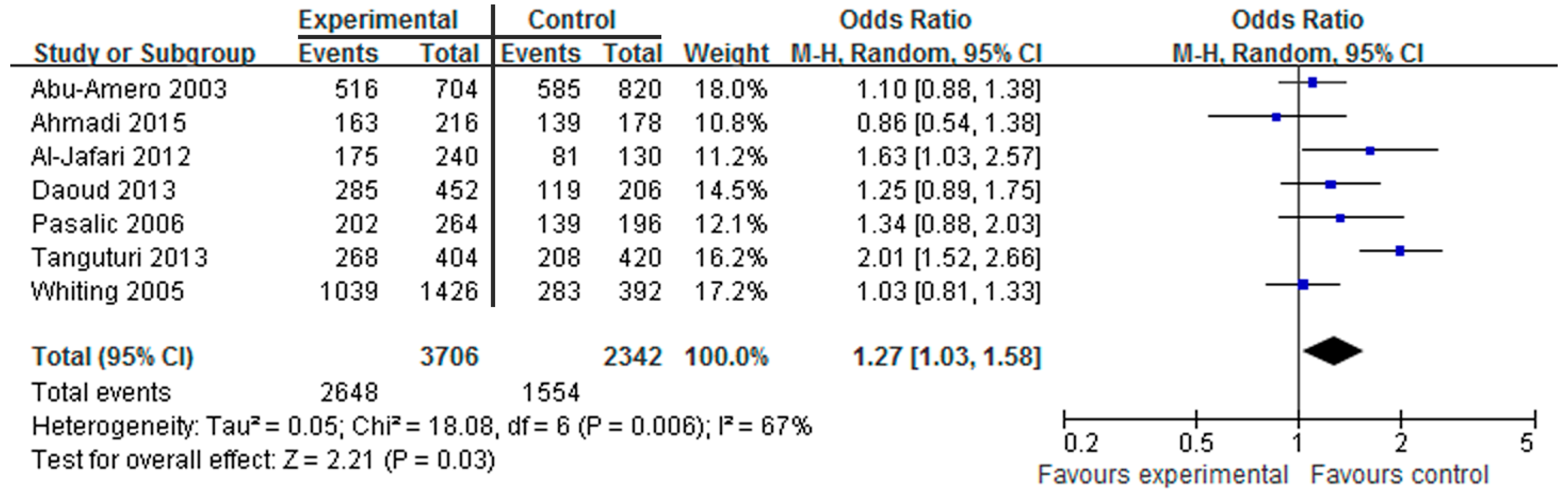 | Abu-Amero [14] | 2003 | 138 | 225 | 68 | 501 | 361 | 182 | 248 | 81 | 612 | 410 | 431/511 | Yes |