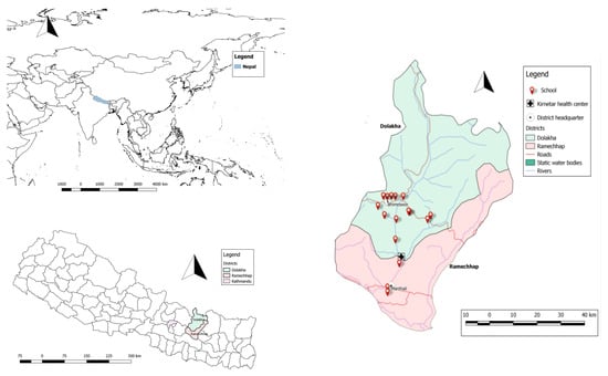 Top left: World map showing Nepal; Bottom left: Map of Nepal highlighting Dolakha and Ramechhap districts; Right: Map of Dolakha and Ramechhap districts showing the surveyed schools.