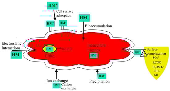 Advances in the understanding of metabolic pathways of microorganisms are responsible for metal sequestration, improving microbial survival rates, and their stability. This has led to the manipulation of metal adsorption []. Adsorption is the physical adherence of ions and molecules onto the surface of another molecule. The material accumulated at the interface is the adsorbate and the solid surface is the adsorbent. If adsorption occurs and results in the formation of a stable molecular phase at the interface, this can be described as a surface complex. Most solids, including microorganisms, possess functional groups like –SH, –OH, and –COOH on their surfaces, that helps in the adsorption of metals []. It has been reported that a microbial cell develops resistance to heavy metals through the excretion of metal chelating substances, or through a problem in a particular transport system, which results in a reduced cell accumulation of the metal ion. Another resistance mechanism includes the binding of a metal ion to intracellular molecules, such as metallothionein, vacuole, or mitochondria, which results in changes in the distribution of metal ion []. Microorganisms interact with metal ions through cell wall associated metals, intracellular accumulation, metalsiderophore, extracellular polymeric reactions with transformation, extracellular mobilization or immobilization of metal ions, and volatilization of metals [].