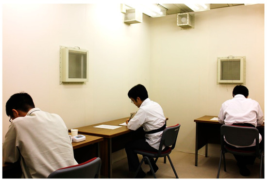 The experiment room in which Japanese cedar wood essential oil was diffused. Three participants entered the experiment room at the same time, sat facing the wall, performed a monotonous task during the work period, and then remained in their seats during the rest period.