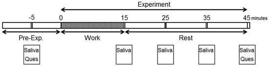 To investigate the effects of Japanese cedar wood essential oil after monotonous work, saliva collection, and subjective assessments were performed in this study (Figure 2). VOCs in Japanese cedar wood essential oil diffused into the experiment room were analyzed. During the work period, participants performed arithmetic work and then rested while remaining seated and quiet.