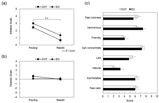 Subjective effects of the odor of the experiment room. (a) Irritation scores reported by participants in the control (square) and Japanese cedar wood essential oil (experimental; circle) conditions. CNT indicates the control condition, while EO indicates the experimental condition. Differences in pre-experiment and the end of experiment values were significant in both conditions (p < 0.01). Data are shown as mean ± SEM; (b) Hedonic scores reported by participants in the control (square) and Japanese cedar wood essential oil (circle) conditions. No significant differences between conditions were observed. Data are shown as mean ± SEM; (c) Visual analog scale scores reported by participants in the control (white) and Japanese cedar wood essential oil (black) conditions. Differences between conditions were not significant. Data are shown as mean ± SEM.