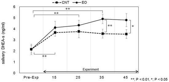 Variation of salivary DHEA-s levels at pre- and during-experiment measurements. The plot in Figure 4 describes changes in the salivary DHEA-s levels of participants in the control (square) and Japanese cedar essential oil (experimental; circle) conditions. CNT indicates the control condition, while EO indicates the experimental condition. Differences observed 35 and 45 min after the calculation task between conditions were significant (p < 0.01, p < 0.05, respectively). Differences in pre-experiment and during-experiment values between conditions were significant (p < 0.01, p < 0.05, respectively). ** Statistical significance (p < 0.01), * statistical significance (p < 0.05). Data are shown as mean ± SEM.