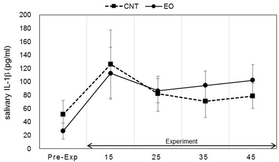 Variation of salivary IL-1β levels at pre- and during-experiment measurements. The plot in Figure 5 describes changes in the salivary IL-1β levels of participants in the control (square) and Japanese cedar wood essential oil (experimental; circle) conditions. CNT indicates the control condition, while EO indicates the experimental condition. Differences between conditions were not significant. Data are shown as mean ± SEM.