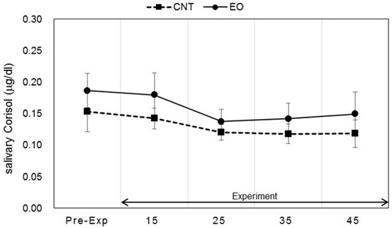 Variation of salivary cortisol levels at pre- and during-experiment measurements. The plot in Figure 6 describes changes in the salivary cortisol levels of participants in the control (square) and Japanese cedar wood essential oil (experimental; circle) conditions. CNT indicates the control condition, while EO indicates the experimental condition. Differences between conditions were not significant. Data are shown as mean ± SEM.
