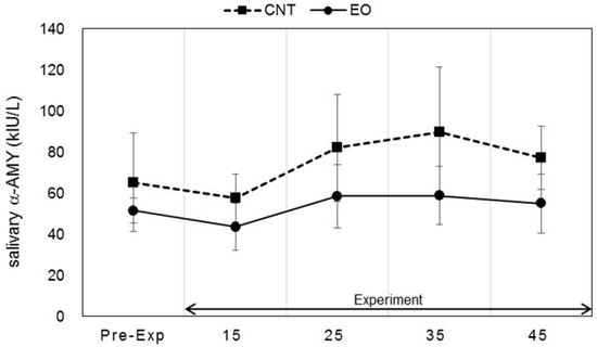 Variation of salivary α-amylase levels at pre- and during-experiment measurements. The plot in Figure 7 describes changes in the salivary α-amylase levels of participants in the control (square) and Japanese cedar wood essential oil (experimental; circle) conditions. CNT indicates the control condition, while EO indicates the experimental condition. Differences between conditions were not significant. Data are shown as mean ± SEM.