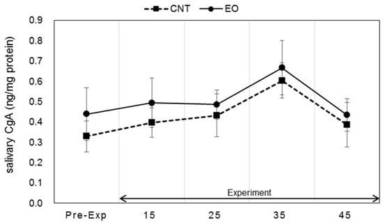 Variation of salivary CgA levels at pre- and during-experiment measurements. The plot in Figure 8 describes changes in the salivary CgA levels of participants in the control (square) and Japanese cedar wood essential oil (experimental; circle) conditions. CNT indicates the control condition, while EO indicates the experimental condition. Differences between conditions were not significant. Data are shown as mean ± SEM.