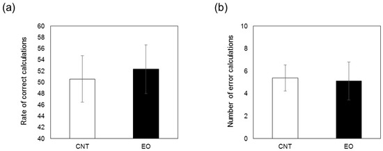 (a) Rate of correct calculations during arithmetic work. The bars represent the rate of correct calculations in the control (white) and Japanese cedar wood essential oil (experimental; black) conditions. CNT indicates the control condition, while EO indicates the experimental condition. Differences between both conditions were not significant. Data are shown as mean ± SEM; (b) Total number of error calculations during arithmetic work. The bars represent the total number of correct calculations in the control (white) and Japanese cedar wood essential oil (black) conditions. Differences between conditions were not significant. Data are shown as mean ± SEM.