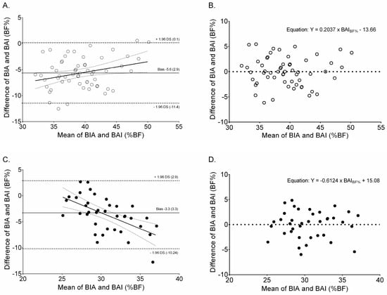 The participants, both males and females, were then divided according to BF%. Table 3 shows that BAI-BF% underestimated BF%, at all levels of adiposity. However, significant differences were found between the sexes when BF% was greater than 30% (p < 0.05 for all). For both women and men, the Lin’s concordance correlation coefficient was moderate, ρc = 0.877 (95% CI = 0.655 to 0.864) and ρc = 0.719 (95% CI = 0.458 to 0.854), respectively (p < 0.01 in every case).
