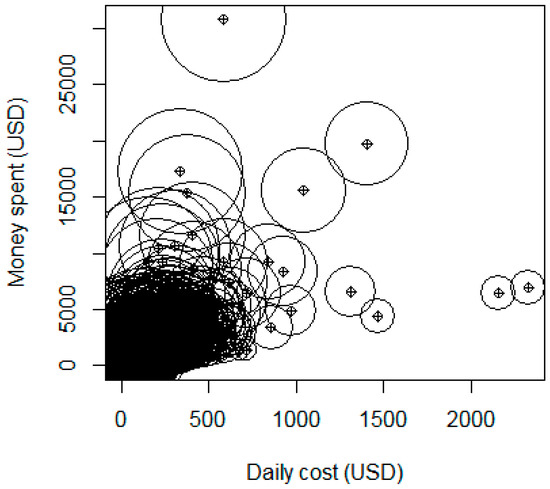 Figure 2 represents data points, each with three numerical values of average daily cost (horizontal axis in U.S. dollar per day) in relation to the total health care expenses for the treatment (vertical axis; in U.S. dollar) and number of days in the hospital (taking the natural logarithm to reduce the difference in effect size for better visualization). The differences among patients are quite substantial. If patients have to pay a significant amount daily, they will soon quit the treatment. A large proportion of this sample spent long time in hospital with average cost less than U.S. $500 per day (bigger circle, concentrate near the origin of the axis).