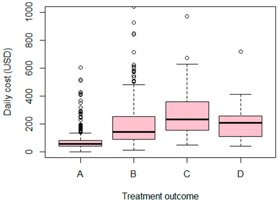 Treatment outcomes in relation to average daily cost. Treatment outcomes. A—Full recovery; B—Partial recovery; C—Stopped in middle; D—Unsuccessful treatment, including mortality.