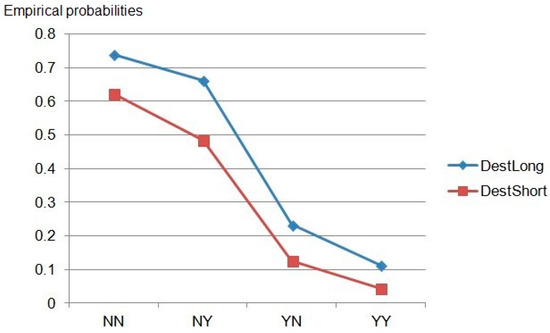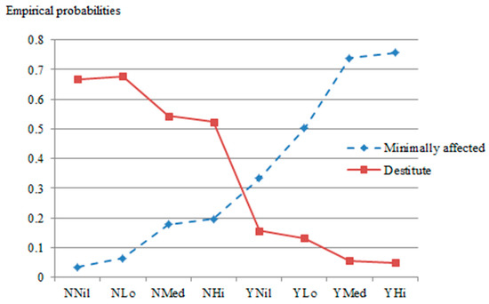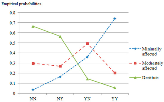 The diamond dotted line indicates how changes in the effects of residency and insurance status improve patients’ financial welfare depending on insurance and residency status. It can be seen that the probability line of “Destitute” goes downward whereas “Minimally affected” goes upward from NN (non-resident & uninsured) to YY (resident & insured). Therefore, being both non-resident and uninsured amplified the risk of falling into post-treatment destitution.