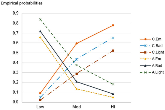 The coefficient of “AvgCost” is larger than that of “Illness”, which indicates a strong influence of “AvgCost” on patients. π̂A, π̂B, π̂C calculated from Equations (10) and (11) show that the probability of a patient who suffers a severe illness and has to pay at a high level of medical fee being indigent is very high, amounting to nearly 78%. Likewise, the probability of a person who has a light disease and pays at a low level being minimally affected is about 84%. Table 7 shows us actual empirical computations of related probabilities.