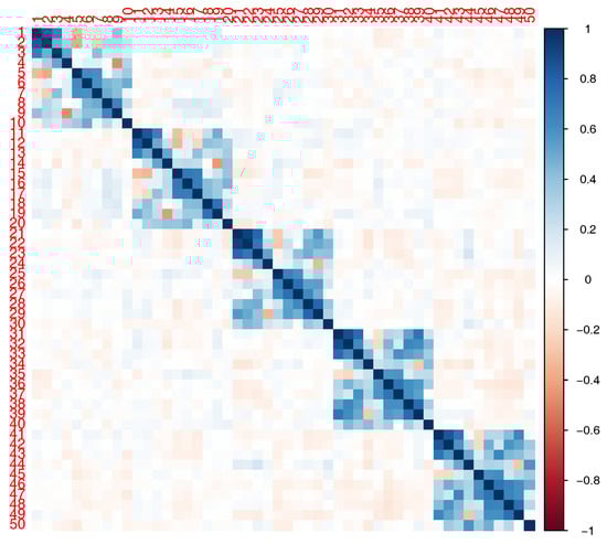 Correlation of the 50 simulated single nucleotide pollymorphisms (SNPs) in linkage disequilibrium (LD). The vertical color line to the right indicates the level of correlation between the SNPs. The dark blue (red) means high positive (high negative) correlation and the light blue (red) means low positive (low negative) correlation.