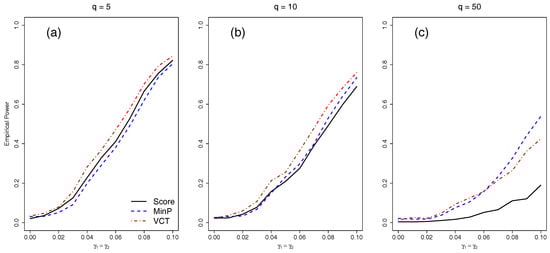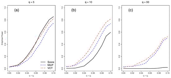 Empirical power at 0.05 -level of the methods for q independent SNPs of which two of the SNPs have a main effect. The same two SNPs have an equal interaction with the environment. (a) independent SNPs; (b) independent SNPs; (c) independent SNPs.