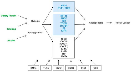 The evidence of association of cigarette smoking and alcohol consumption with rectal cancer has been inconclusive [15,16,17,18,19,20,21,22,23]. Nicotine in tobacco smoke and ethanol has been shown to stimulate angiogenesis under ischemic conditions [24,25], thus examining these associations in genetically susceptible individuals carries the potential of strengthening these associations. In addition, certain dietary patterns, specifically those that contain high consumption of red and processed meat, are associated with a moderate increased risk of rectal cancer [26,27,28,29,30]. Plausible mechanisms are related to the content of meat (protein, iron) [31,32,33] not absorbed by the small intestine and transferred to the large intestine lumen and, when in excess, may have toxic effects on the large intestine mucosa [34]. The higher intake of protein and a decrease in its digestibility leads to more undigested proteins fermented by colonic bacteria which may promote DNA damage and loss of large intestine epithelial cell homeostasis and ultimately tumor growth [34]. Protein fermentation mainly occurs in the distal parts of the colon and rectum and previously reported associations of meat intake have been generally stronger for distal colon and rectal cancer [35,36] while animal protein intake has been previously associated with colorectal adenoma [37]. Diet is a complex mixture of many nutrients and characterization of GEI could help determine the specific nutrients affecting the cancer risk and cancer-related mortality. We focused on animal protein as a nutrient based on its documented stimulatory effect on angiogenesis [38,39].