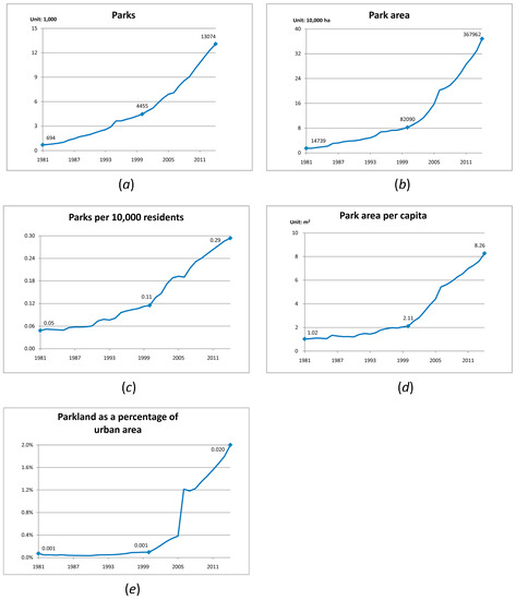 City park statistics in China between 1981 and 2014: (a) Parks; (b) Park area; (c) Parks per 10,000 residents; (d) Park area per capita; (e) Parkland as a percentage of urban area.