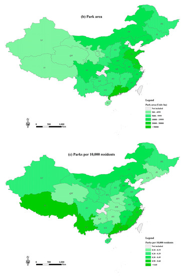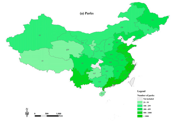 All five indicators were mapped at the provincial level (Figure 2). Guangdong had the most and Qinghai the least number of parks (respectively 3408 and 29) with Henan at the median with 306 parks. Guangdong had the most and Tibet the least park area (70,151 ha and 723 ha) with a median of 9555 ha in Hunan. Four provinces had both more than 500 parks and 15,000 ha of park area (Guangdong, Zhejiang, Jiangsu and Shandong). In contrast, there were four provinces with both less than 100 parks and 5000 ha of park area (Ningxia, Hainan, Qinghai and Tibet).