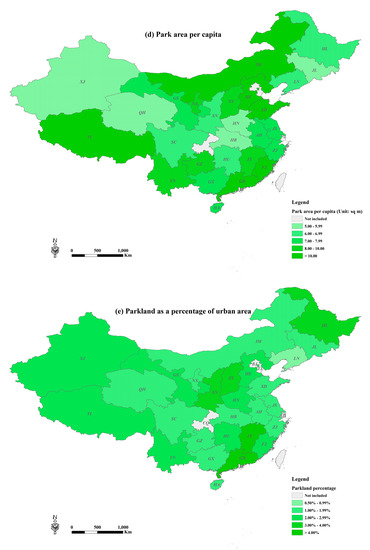 Every 10,000 residents had 0.88, 0.24 and 0.10 parks in Tibet, Shanxi and Guizhou respectively, representing the maximum, median and minimum areas. Urban residents in Inner Mongolia had the largest average park area (13.84 m2 per capita). Henan had the smallest park area per capita with each resident getting access to about 5.00 m2. Hainan had the median park area with 7.85 m2 per capita. Parkland percentage in Guangdong, Sichuan and Liaoning was the highest (4.12%), median (1.92%) and lowest (0.98%) respectively. The national average on the three ratio indicators (parks per 10,000 residents, per capita park area and parkland percentage) was 0.29, 8.26 m2 and 2.00% respectively. Four provinces had greater values of these indicators (Guangdong, Hebei, Jiangxi and Tibet).