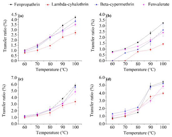 Effect of water temperature on the transfer ratio (defined as the ratio of the amounts of residues in tea and water) of the four pyrethroid residues from wolfberry (a); licorice (b); honeysuckle (c); and chrysanthemum (d) tea leaves to infusion.