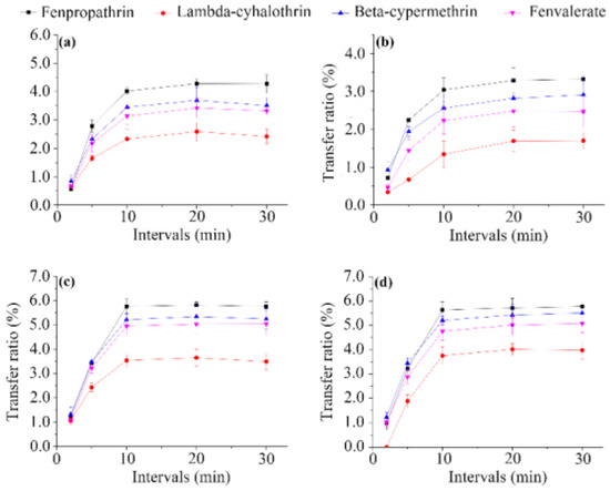 Effect of infusion interval on transfer ratios of the four pyrethroid residues from wolfberry (a); licorice (b); honeysuckle (c); and chrysanthemum (d) tea to infusion.