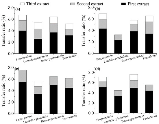 The second main factor affecting the transfer rate of the pesticides is their octanol–water partition coefficient. Pesticides with larger Kow values would strongly associate with tissues and would not move to the surrounding water, thus resulting in a minimum transfer to the infusion [34]. In this study, the transfer rates of the pesticides showed a negative correlation with log Kow (Figure 5b). The R2 values ranged from 0.9612 to 0.9982, respectively, indicating a good linearity.