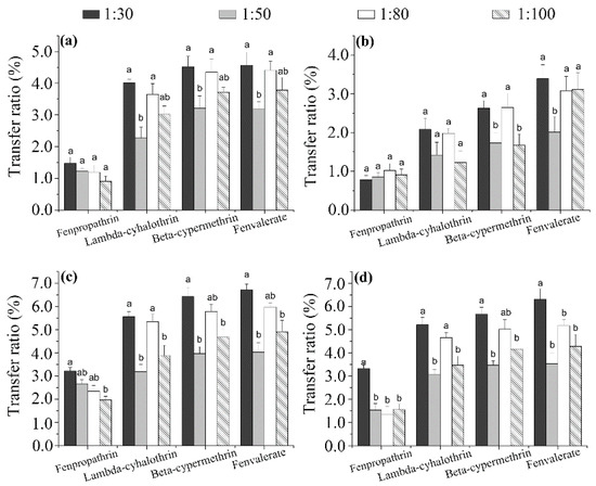 Effect of tea/water ratio on the transfer ratios of the four pyrethroid residues from wolfberry (a); licorice (b); honeysuckle (c); and chrysanthemum (d) tea to infusions. Different minor case letters (a, b) at the top of the columns mean significant differences of transfer ratio at a p value of 0.05.