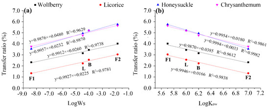 As water is the main carrier of pesticides during tea brewing, the extraction rate of pesticide residues in water has been found to be related to their water solubility. Most studies have demonstrated that the transfer rates increased as the Ws of the pesticides increases [20,32,33]. However, low transfer rates (<5%), insensitive to variations in water solubility, were observed when the Ws of the pesticides was lower than 10 mg·L−1 [26]. In this study, a clear linear relationship was found between the logarithm of Ws and the transfer rate of the four pesticides (Figure 5a), with correlation coefficients higher than 0.96 in all cases, indicating a good linearity.
