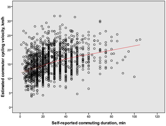 The relation between self-reported durations and estimated velocities for commuter cyclists (n = 1661, 34% males). The line fits 85% of the individual values.