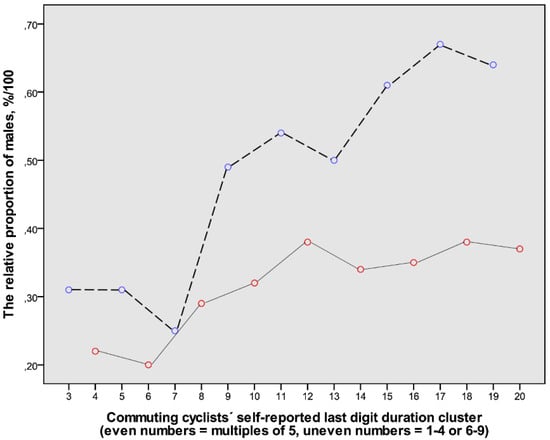 The duration values were divided into consecutively numbered clusters of last digit categories: cluster 1 = last digits 1–4; cluster 2 = 5; cluster 3 = 6–9; cluster 4 = 10; cluster 5 = 11–14, and so forth up to cluster 20, which represented the 50-min duration. The sex distribution was analysed in clusters 3–20 (Figure 4). It showed that males in general report durations with the last digits 1–4 and 6–9 to a greater extent than females, and that this is even clearer with increasing trip duration.