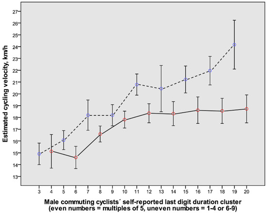 The relation between consecutive clusters of self-reported cycling durations and the estimated cycling velocities for males (mean value and 80% confidence interval) (n = 498). The even-numbered clusters represent durations with the last digits being 0 or 5 (red symbols connected with continuous lines). The uneven-numbered clusters represent durations with the last digits being 1–4 or 6–9 (blue symbols connected with dashed lines). For further explanations, see legend to Figure 4 and Methods.