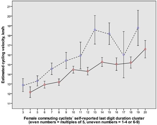 The relation between consecutive clusters of self-reported cycling durations and the estimated cycling velocities in females (mean value and 80% confidence interval) (n = 1018). The even-numbered clusters represent durations with the last digits being 0 or 5 (red symbols connected with continuous lines). The uneven-numbered clusters represent durations with the last digits being 1–4 or 6–9 (blue symbols connected with dashed lines). For further explanations, see legend to Figure 4 and Methods.