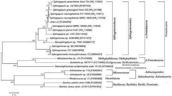 The PCR products of the 16S rDNA were sequenced by the BGI Company, and the accession number in the NCBI is KU954525. The phylogenetic tree was constructed with the homology of 97%. The nucleotide sequence of 16S rDNA from a7 was mostly similar to that of Sphingopyxis macrogoltabida strain NBRC 15033 (99% similarity, accession number: NR_113720.1). It suggested that strain a7 belongs to genus Sphingopyxis. The phylogenetic tree was constructed using a neighbor-joining analysis with 1000 bootstrap replication, as shown in Figure 2.